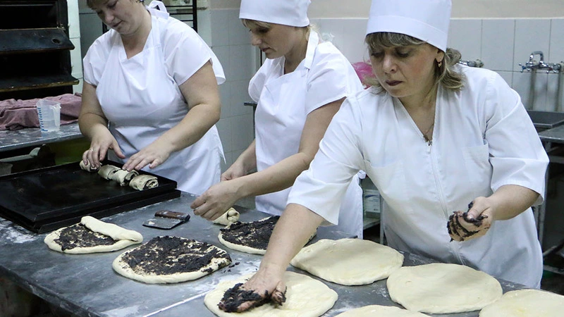 В одной смене с заведующей трудятся опытные пекари Любовь Круговая и Екатерина Прокофьева, работающие на предприятии больше 15 лет, и Яна Калашникова, стаж которой не такой большой, однако руководство отмечает её как хорошего кондитера, быстро всё схватывающего. Когда я пришла посмотреть, как идёт работа в цеху, процесс был в самом разгаре. Тесто замешано, печи раскалены, все начинки сделаны. И тут началась лепка рулетов с маком. Я даже не успевала фотографировать, кондитеры так умело и быстро втроём всё делали, что можно только удивляться их мастерству. При этом была очень тёплая (это не из‑за того, что в цеху во время смены жарко) и приятная атмосфера, девочки шутили и смеялись, а противни тем временем как по волшебству заполнялись рулетами. Рядом над караваем колдовала Татьяна Николаевна.
